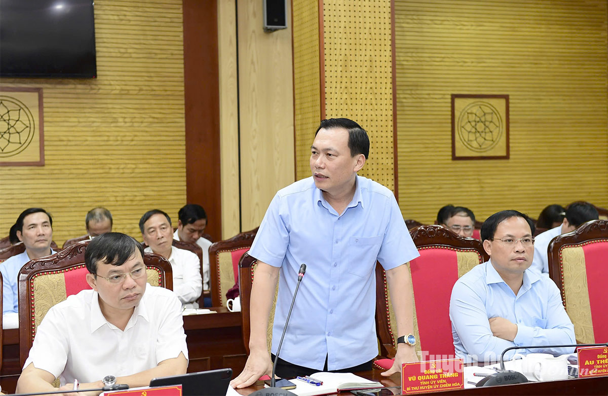 Đồng chí Bí thư Huyện ủy Chiêm Hóa Vũ Quang Thắng Phát biểu thảo luận tại hội nghị. Ảnh: Quốc Việt.