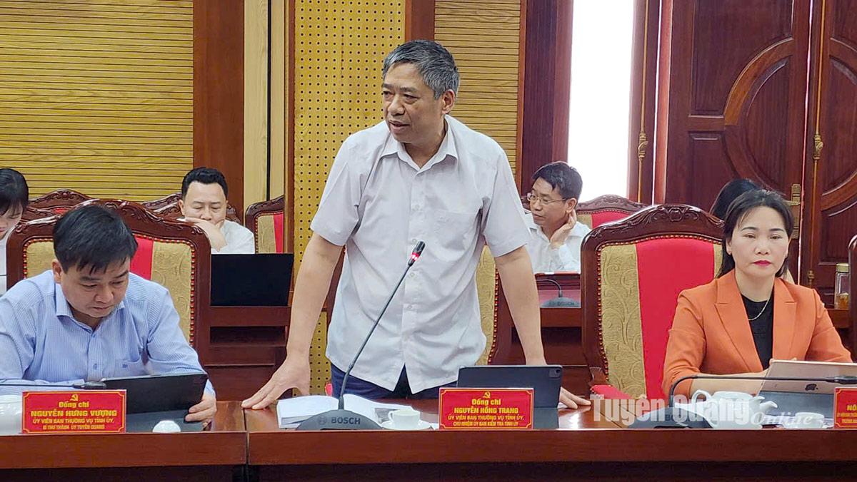 Đồng chí Nguyễn Hồng Trang, Ủy viên Ban Thường vụ Tỉnh ủy, Chủ nhiệm UBKT Tỉnh ủy phát biểu, đề nghị cập nhật thêm số liệu từ 2 cuộc kiểm tra, giám sát của Ban Thường vụ Tỉnh ủy để có số liệu cụ thể và có những đánh giá toàn diện hơn trong các nghị quyết.