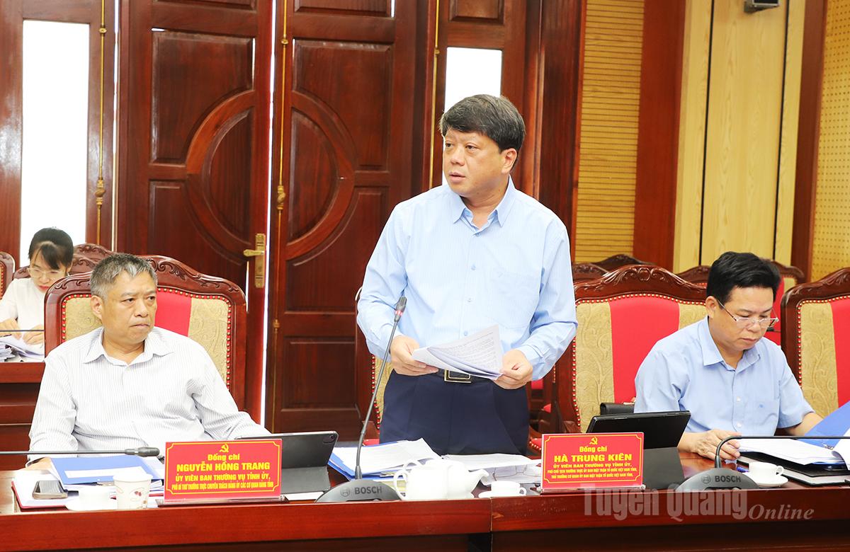 Phó Chủ tịch Thường trực Ủy ban MTTQ tỉnh Hà Trung Kiên báo cáo công tác chuẩn bị Đại hội đại biểu MTTQ tỉnh Tuyên Quang tại hội nghị.