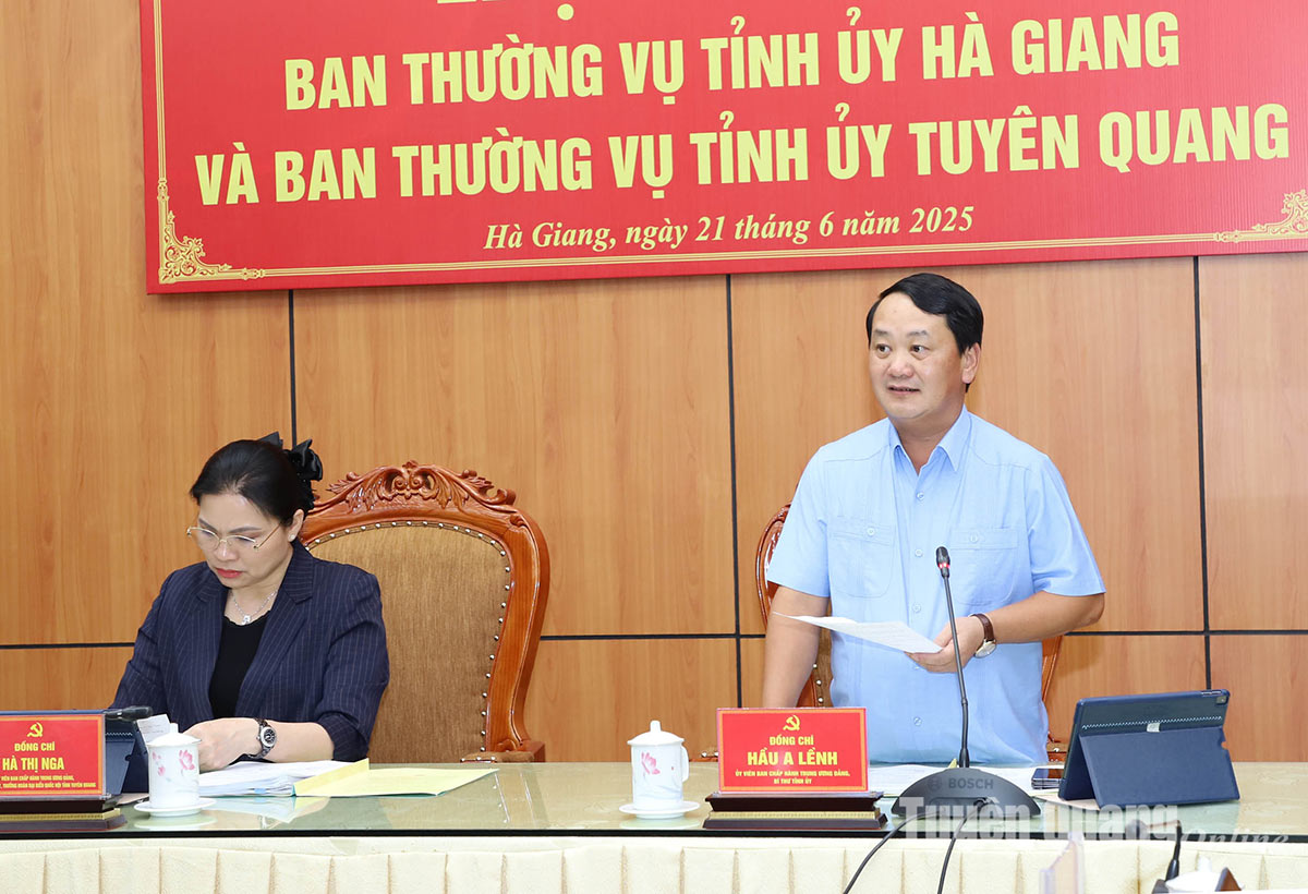 Bí thư Tỉnh ủy Hà Giang Hầu A Lềnh và Bí thư Tỉnh ủy Tuyên Quang Hà Thị Nga chủ trì hội nghị.