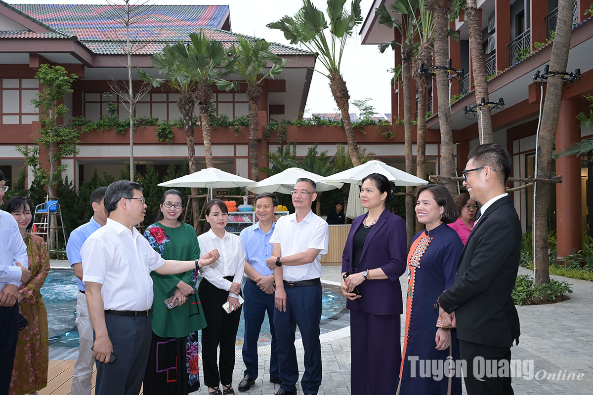 Các đồng chí lãnh đạo tỉnh tham quan các hạng mục của khách sạn Flamingo Heritage Onsen & Resort. Ảnh: Quang Hòa.