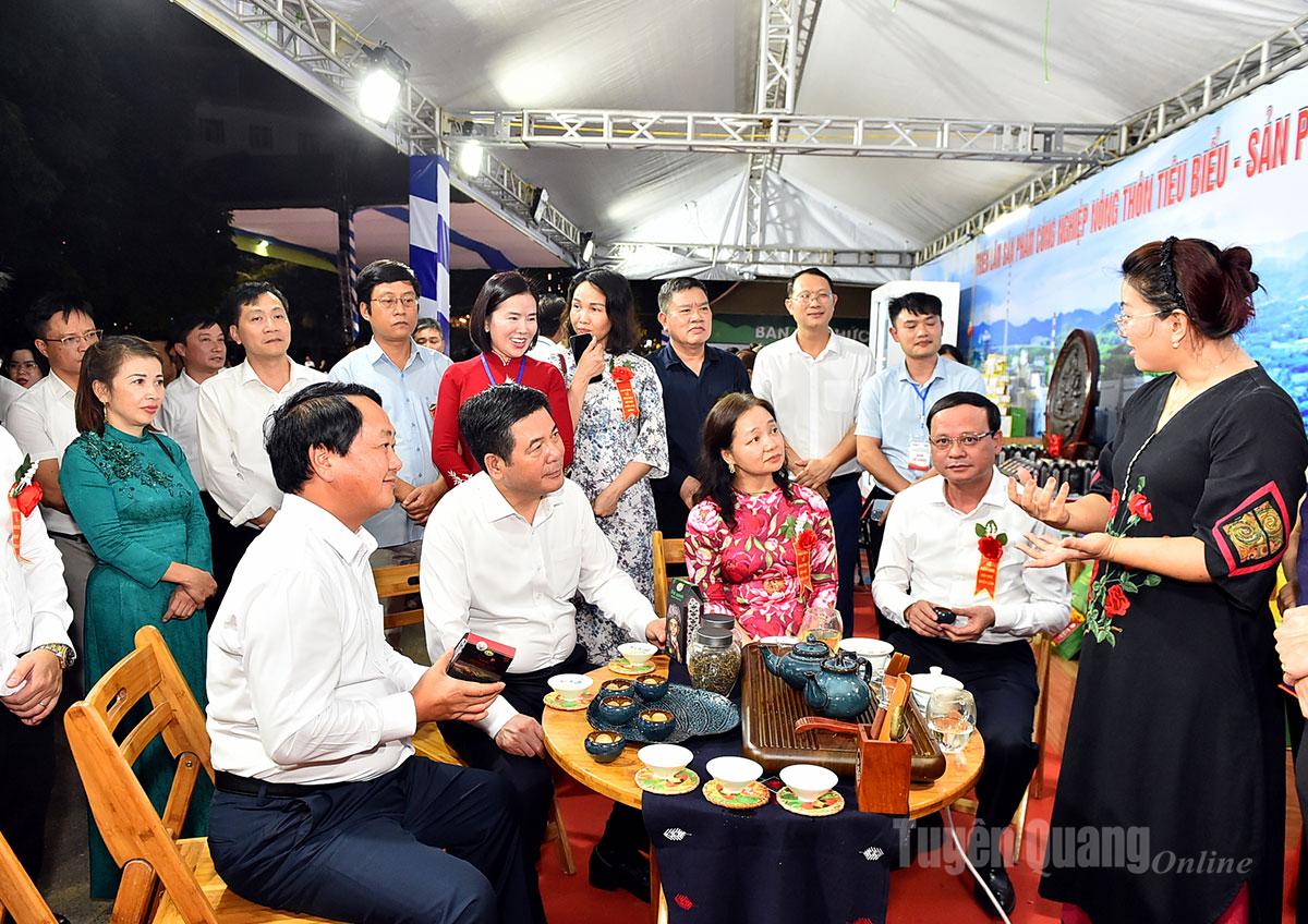 Các đại biểu tham quan gian trưng bày giới thiệu các sản phẩm trà của tỉnh Tuyên Quang.