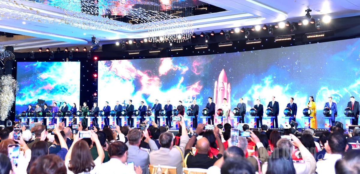 Các đồng chí lãnh đạo, nguyên lãnh đạo Đảng, Nhà nước, Chính phủ, Quốc hội và các bộ, ngành Trung ương và các tỉnh, thành phố thực hiện nghi lễ khai mạc triển lãm.