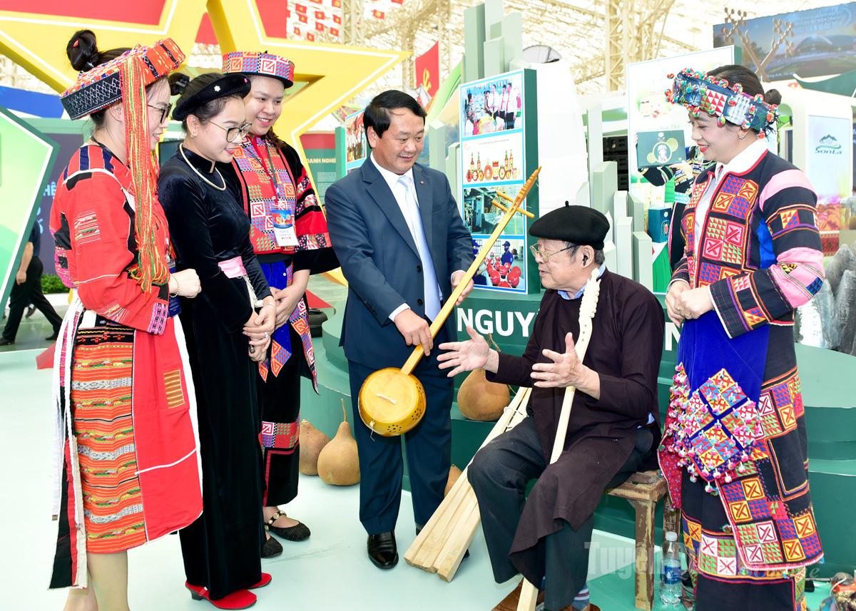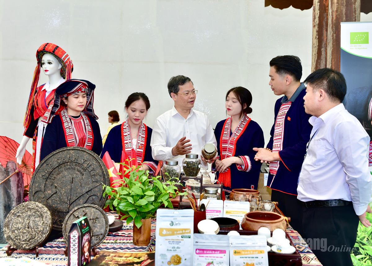 Đồng chí Phan Huy Ngọc, Phó Bí thư Tỉnh ủy, Chủ tịch UBND tỉnh tham quan, nghe giới thiệu về gian Triển lãm của tỉnh Tuyên Quang.