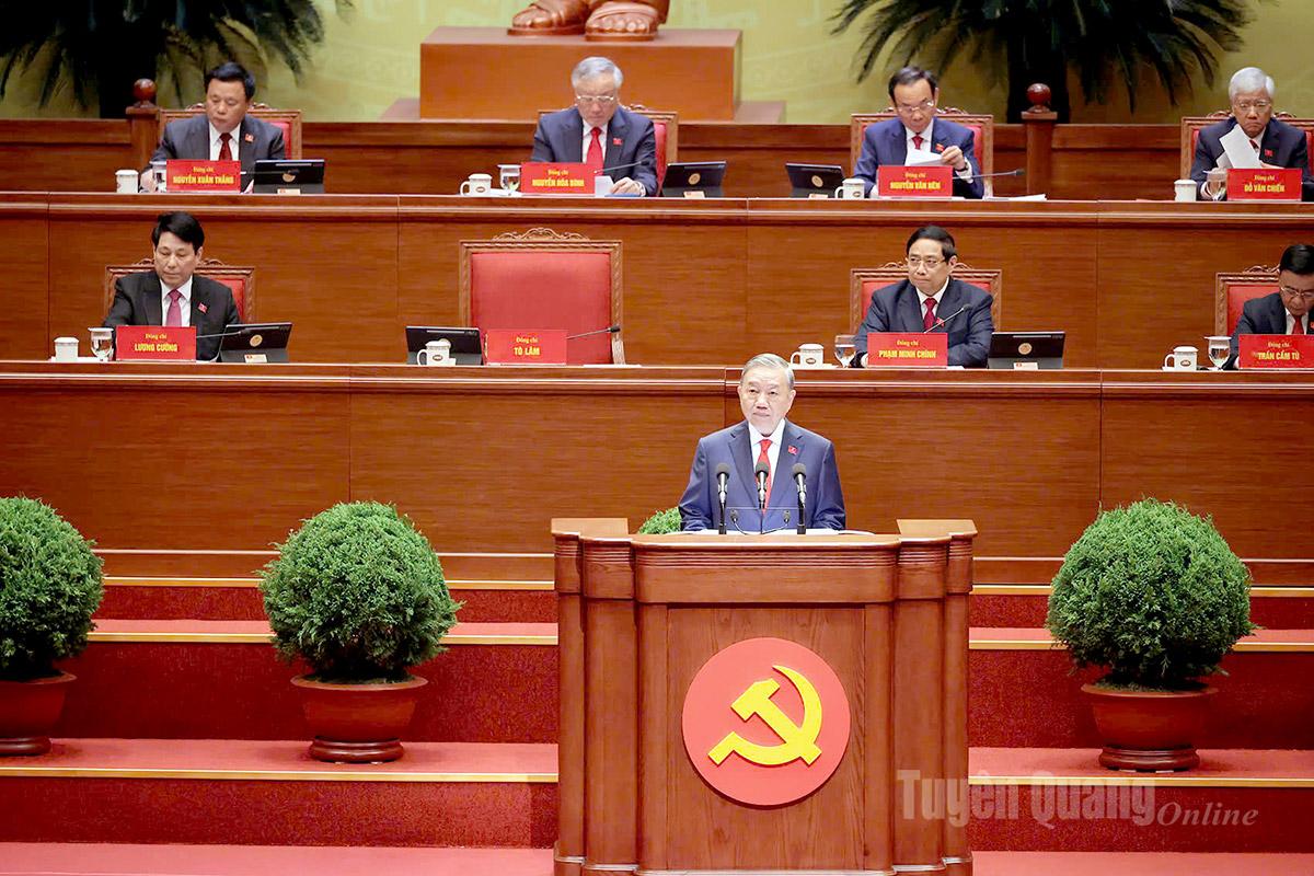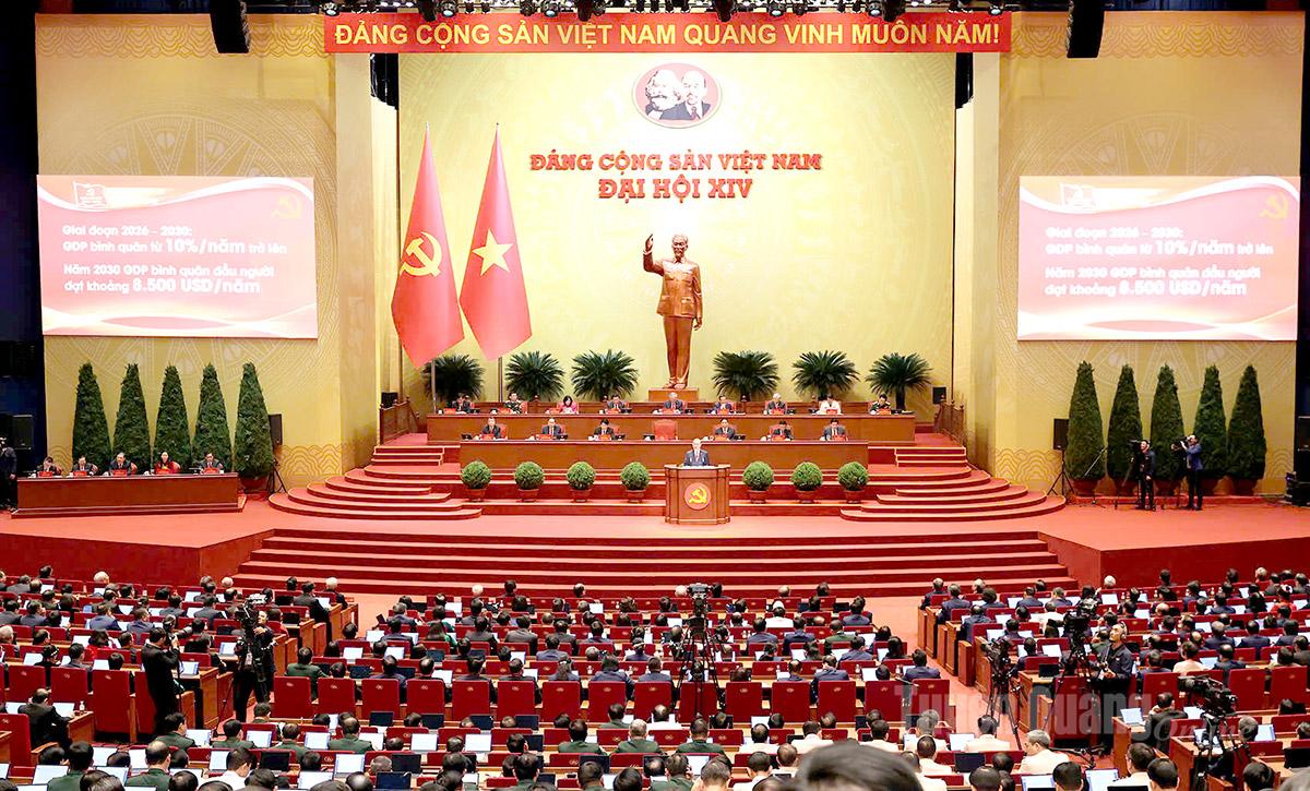 Trình bày báo cáo về các văn kiện trình Đại hội XIV của Đảng, Tổng Bí thư Tô Lâm nhấn mạnh, đây là sự kiện chính trị đặc biệt trọng đại của toàn Đảng, toàn dân, toàn quân ta; là dấu mốc mở ra chặng đường phát triển mới của đất nước trong bối cảnh, cục diện và mục tiêu mới; là Đại hội của ý chí tự chủ chiến lược, tự lực, tự cường, tự hào dân tộc, của khát vọng vươn lên, của niềm tin son sắt vào con đường mà Đảng, Bác Hồ và Nhân dân ta đã lựa chọn.