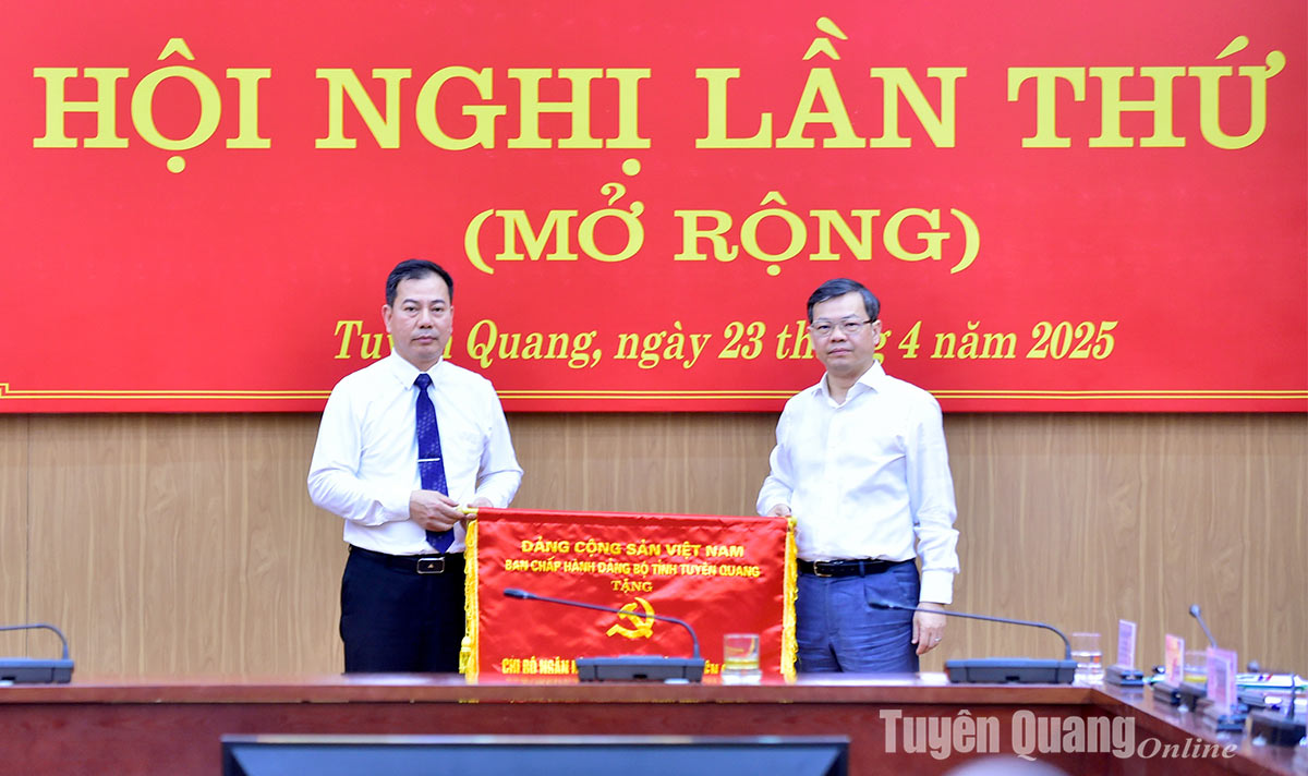 Đồng chí Nguyễn Văn Sơn, Bí thư Đảng ủy, Chủ tịch UBND tỉnh trao Cờ cho Chi bộ Ngân hàng Nhà nước tỉnh - Đơn vị "Hoàn thành xuất sắc nhiệm vụ" tiêu biểu 5 năm liền.