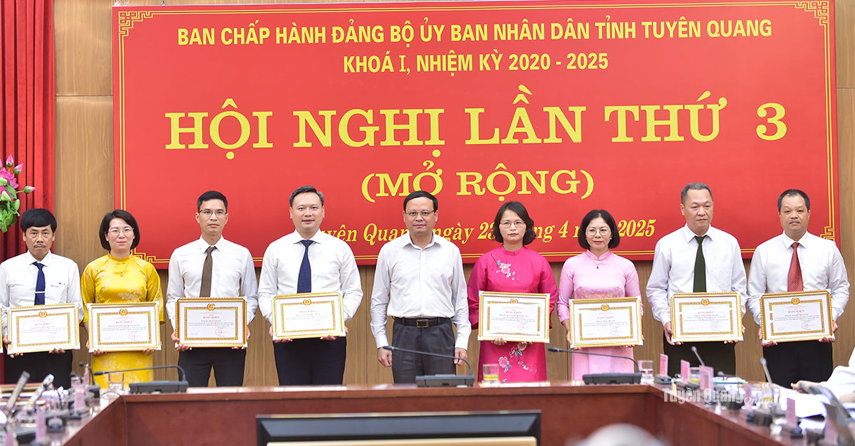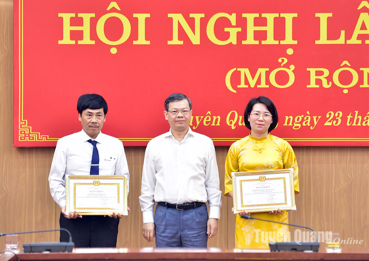 Hội nghị đã công bố và trao khen thưởng của BCH Đảng bộ tỉnh: Tặng Cờ cho 1 tập thể; Bằng khen cho 2 tập thể và 12 cá nhân có thành tích đạt tiêu chuẩn Hoàn thành xuất sắc nhiệm vụ tiêu biểu 5 năm liền.