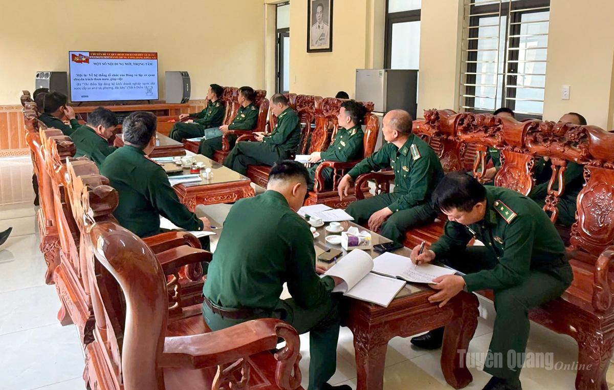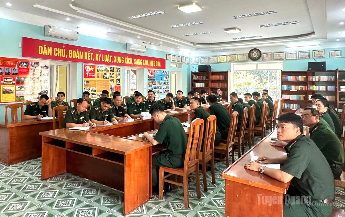 | Chỉ huy, cán bộ Đồn Biên phòng Cửa khẩu Quốc tế Thanh Thuỷ tham gia học tập nghị quyết. Ảnh: Phạm Hoan |