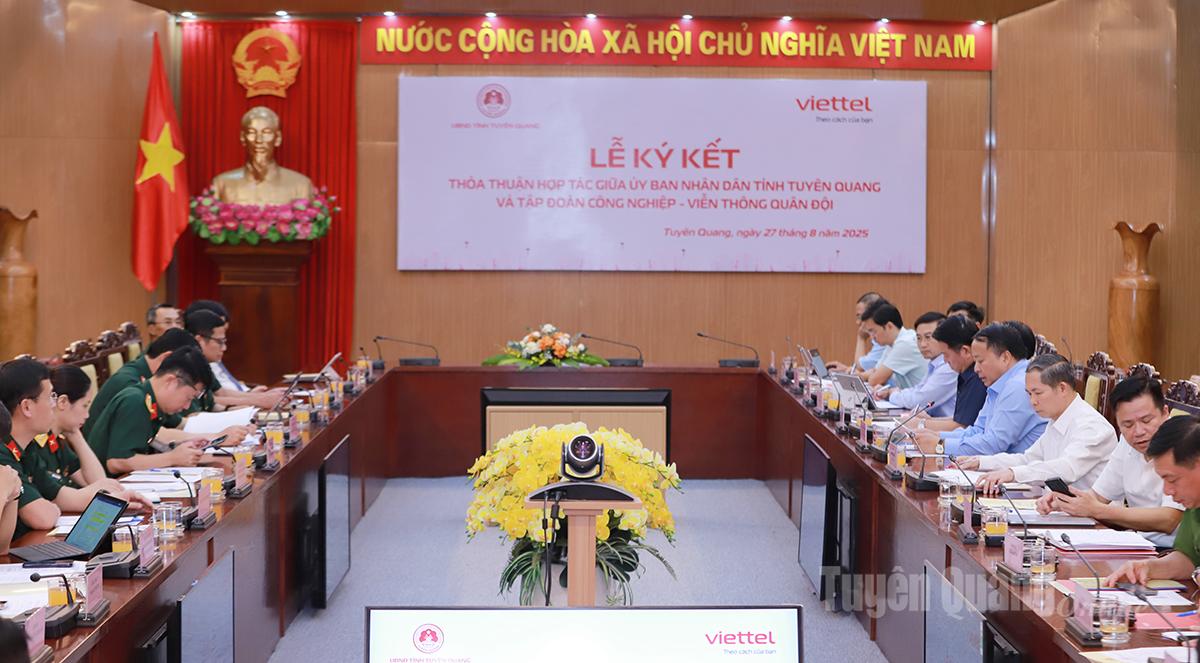 Tại buổi lễ, UBND tỉnh và Tập đoàn Viettel thống nhất ký kết Thỏa thuận hợp tác giai đoạn 2025 - 2030 với 6 nội dung, gồm: Triển khai và sử dụng hiệu quả các nền tảng số dùng chung, bảo đảm kết nối, liên thông thống nhất giữa các ngành, lĩnh vực trên môi trường số; phát triển hạ tầng số, nhân lực số, chính quyền số, xã hội số, kinh tế số. Trong đó trọng tâm vào hoàn thành xây dựng, đưa vào khai thác 114 cơ sở dữ liệu quốc gia và chuyên ngành, ưu tiên các lĩnh vực trọng điểm như y tế, giáo dục, đất đai…; bảo đảm kết nối, xác thực với Cơ sở dữ liệu quốc gia về dân cư và đồng bộ về Trung tâm dữ liệu quốc gia theo Kế hoạch số 02-KH/BCĐTW. Phối hợp triển khai xây dựng trạm BTS phủ sóng di động 4G trên toàn tỉnh, đảm bảo không còn vùng lõm sóng 4G. Giới thiệu các giải pháp liên quan cho tỉnh trong việc tổ chức Trung tâm dữ liệu tỉnh Tuyên Quang theo hướng ứng dụng công nghệ điện toán đám mây, đạt tiêu chuẩn Tier III, đáp ứng nhu cầu chuyển đổi số của tỉnh và hướng tới trung tâm dữ liệu phục vụ phát triển AI. Hỗ trợ quy hoạch, thiết kế hạ tầng logistics với trọng tâm bao gồm: Hệ thống kho lạnh, kho thông minh, Trung tâm Logistics cùng hạ tầng kết nối với các điểm cảng, ga, bến xe, sân bay nhằm thúc đẩy lưu thông hàng hoá tại địa phương, rút ngắn thời gian vận chuyển…