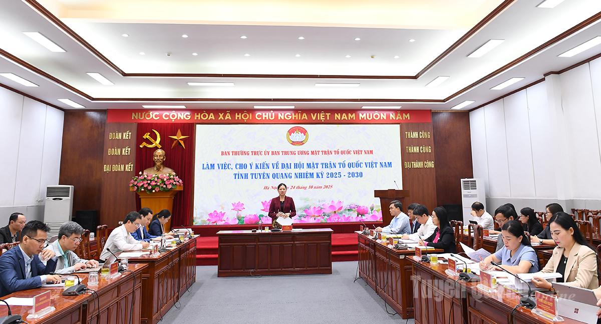 Tham dự buổi làm việc có các đồng chí: Ma Thế Hồng, Phó Bí thư Tỉnh ủy, Chủ tịch Ủy ban MTTQ Việt Nam tỉnh Tuyên Quang; Hà Trung Kiên, Ủy viên Ban Thường vụ Tỉnh ủy, Phó Chủ tịch Thường trực Ủy ban MTTQ Việt Nam tỉnh Tuyên Quang; lãnh đạo các ban chuyên môn Ủy ban Trung ương MTTQ Việt Nam và các cơ quan, đơn vị liên quan.