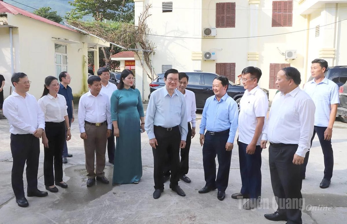 Nguyên Chủ tịch nước Trương Tấn Sang và các đồng chí lãnh đạo tỉnh thăm hỏi tình hoạt động của xã Thanh Thủy sau hợp nhất tinh gọn bộ máy.