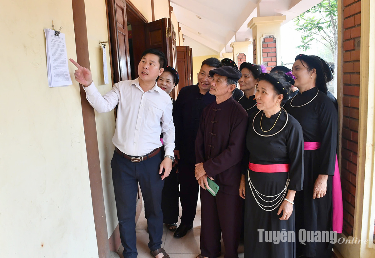 Cán bộ xã Tân Trào (Sơn Dương) hướng dẫn người dân tìm hiểu các đề án sáp nhập đơn vị hành chính.