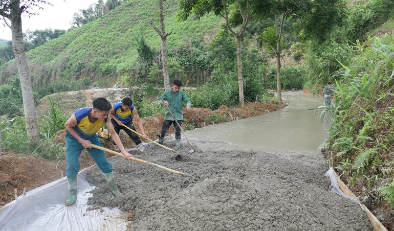 Huy động sức dân góp công, góp sức cứng hóa đường giao thông nông thôn ở xã vùng cao Vĩnh Tuy, tỉnh Tuyên Quang.