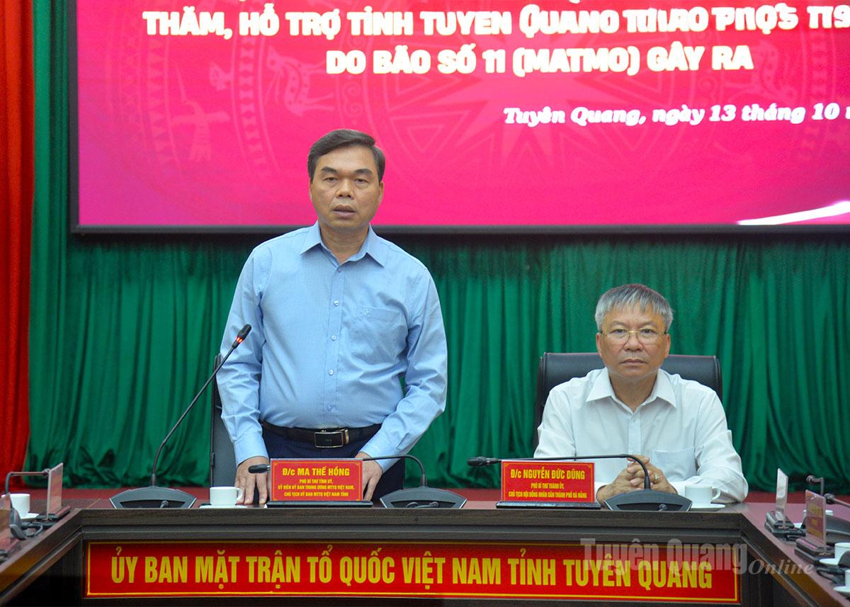 Trong không khí thân tình, Phó Bí thư Tỉnh ủy, Chủ tịch Ủy ban MTTQ Việt Nam tỉnh Ma Thế Hồng trân trọng cảm ơn tình cảm, sự quan tâm và chia sẻ sâu sắc của Đảng bộ, chính quyền, nhân dân thành phố Đà Nẵng đối với tỉnh Tuyên Quang. Đồng chí khẳng định, món quà nghĩa tình mà Đoàn công tác mang đến không chỉ có ý nghĩa vật chất, mà còn là nguồn động viên tinh thần to lớn, tiếp thêm sức mạnh để Đảng bộ, chính quyền và nhân dân toàn tỉnh vượt qua khó khăn, sớm ổn định cuộc sống, khôi phục sản xuất.