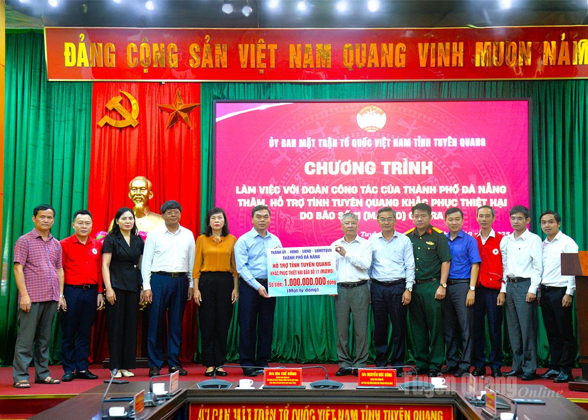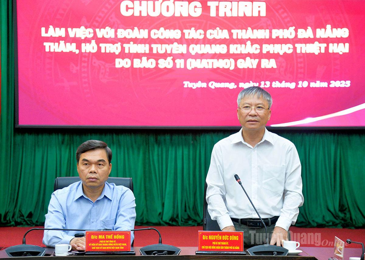 Phát biểu tại buổi gặp mặt, Chủ tịch HĐND thành phố Đà Nẵng Nguyễn Đức Dũng chia sẻ, Tuyên Quang là một trong những địa phương chịu ảnh hưởng nặng nề của bão số 10, 11. Với tinh thần tương thân tương ái, trước những thiệt hại nặng nề của tỉnh, Đảng bộ, chính quyền và nhân dân thành phố Đà Nẵng mong muốn được sẻ chia phần nào khó khăn, góp phần giúp Tuyên Quang sớm khắc phục hậu quả thiên tai, ổn định đời sống nhân dân, hoàn thành các mục tiêu phát triển kinh tế - xã hội năm 2025. Thay mặt Thành ủy, HĐND, UBND và Ủy ban MTTQ Việt Nam thành phố Đà Nẵng, đồng chí Nguyễn Đức Dũng đã trao tặng nguồn hỗ trợ trị giá 1 tỷ đồng cho tỉnh Tuyên Quang.