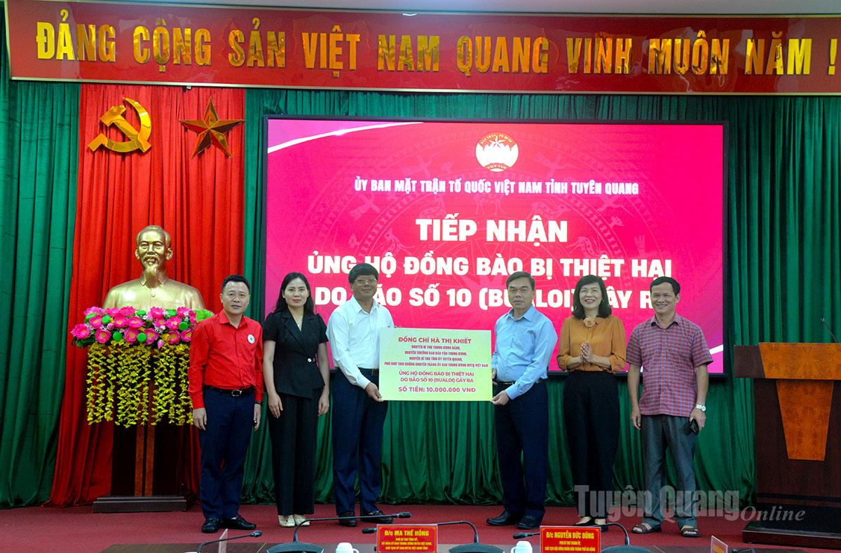 Cũng trong sáng nay, Phó Bí thư Tỉnh ủy, Chủ tịch Ủy ban MTTQ Việt Nam tỉnh Ma Thế Hồng và các đồng chí lãnh đạo tỉnh đã tiếp nhận số tiền hỗ trợ 10 triệu đồng ủng hộ bão lũ của đồng chí Hà Thị Khiết, nguyên Bí thư Trung ương Đảng, nguyên Trưởng Ban Dân vận Trung ương, nguyên Bí thư Tỉnh ủy Tuyên Quang, Phó Chủ tịch không chuyên trách Ủy ban Trung ương MTTQ Việt Nam.