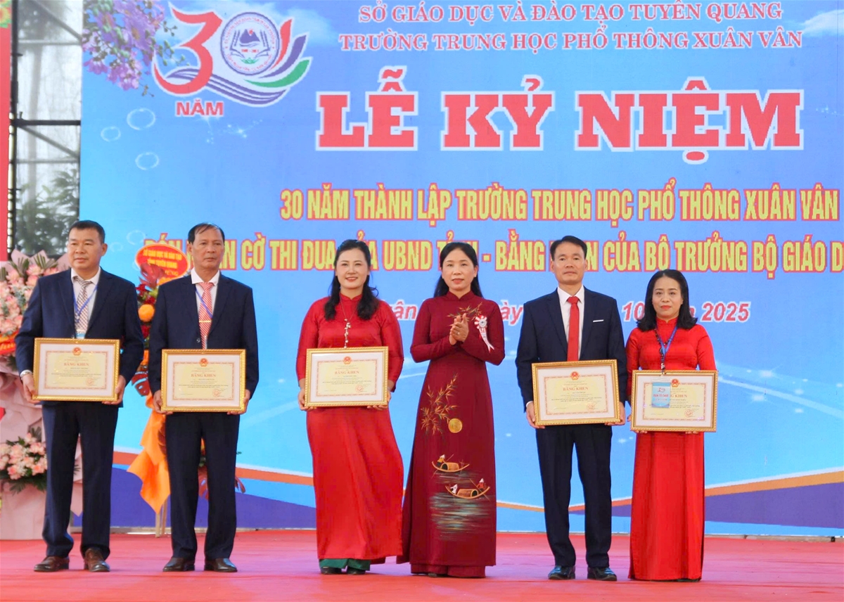Phó Chủ tịch HĐND tỉnh Lê Thị Thanh Trà trao Bằng khen của Bộ Giáo dục và Đào tạo cho tập thể Trường THPT Xuân Vân.