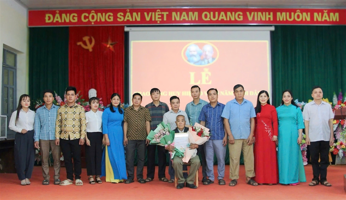 Đồng chí Lê Thị Thanh Trà và các đại biểu tặng hoa chúc mừng đồng chí Tụ Sào Chỉ, đảng viên được nhận Huy hiệu 60 năm tuổi Đảng.