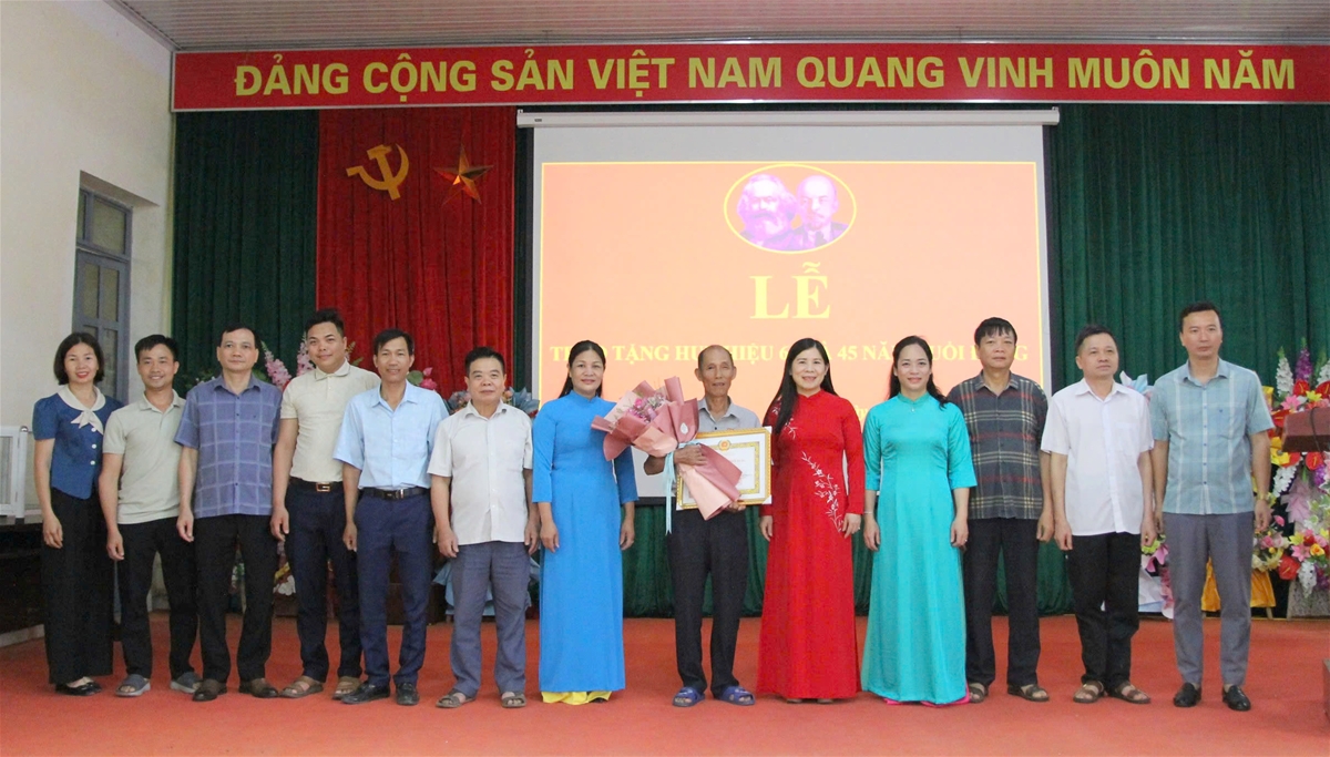Đồng chí Lê Thị Thanh Trà và các đại biểu tặng hoa chúc mừng đồng chí Hoàng Thanh Năm, đảng viên được nhận Huy hiệu 45 năm tuổi Đảng.
