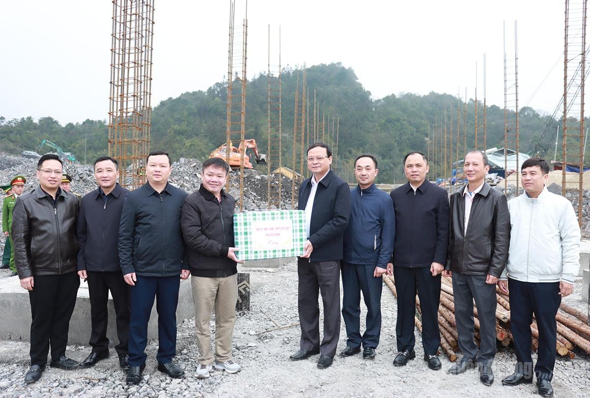 Phó Chủ tịch Thường trực UBND tỉnh Nguyễn Mạnh Tuấn tặng quà công nhân đang làm việc tại công trường.