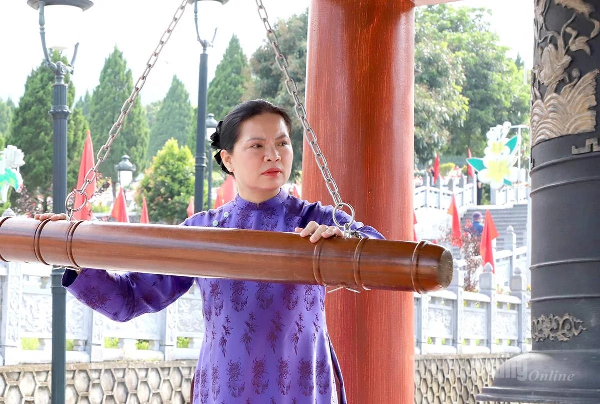 Phó Chủ tịch Ủy ban Trung ương MTTQ Việt Nam Hà Thị Nga thỉnh chuông tại Đền thờ Bác Hồ và các anh hùng liệt sĩ trong khuôn viên Nghĩa trang liệt sĩ Quốc gia Vị Xuyên.