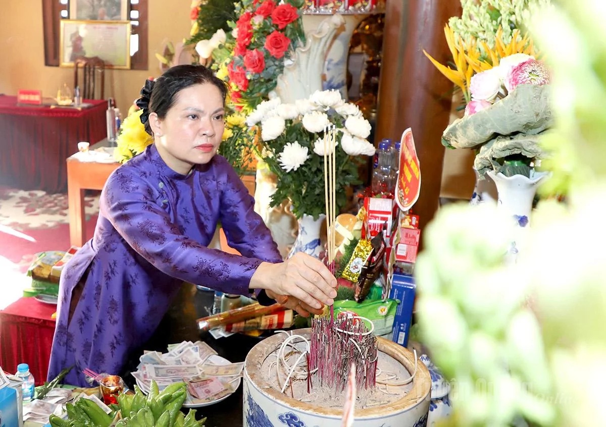 Phó Chủ tịch Ủy ban Trung ương MTTQ Việt Nam Hà Thị Nga thắp hương trước Anh linh Chủ tịch Hồ Chí Minh, Đại tướng Võ Nguyên Giáp và các Anh hùng liệt sĩ tại Đền thờ Điểm cao 468.