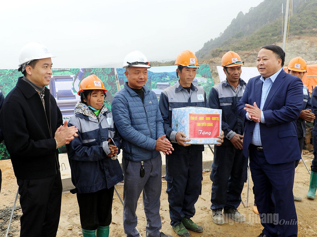 Đồng chí Phan Huy Ngọc, Phó Bí thư Tỉnh uỷ, Chủ tịch UBND tỉnh thăm hỏi, tặng quà cán bộ kỹ thuật, công nhân đang triển khai dự án.