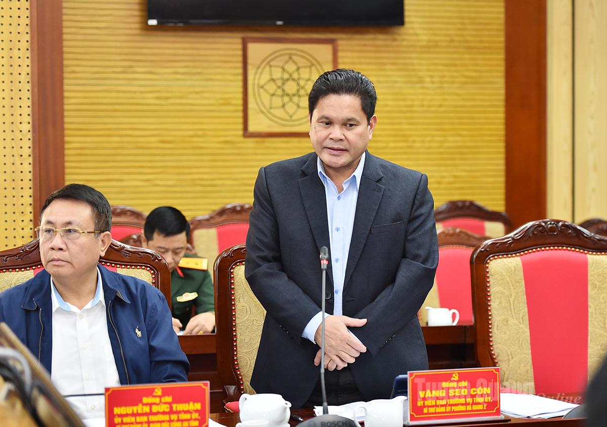 Đồng chí Vàng Seo Cón, Ủy viên Ban Thường vụ Tỉnh uỷ, Bí thư Đảng uỷ phường Hà Giang 2 phát biểu tại hội nghị.