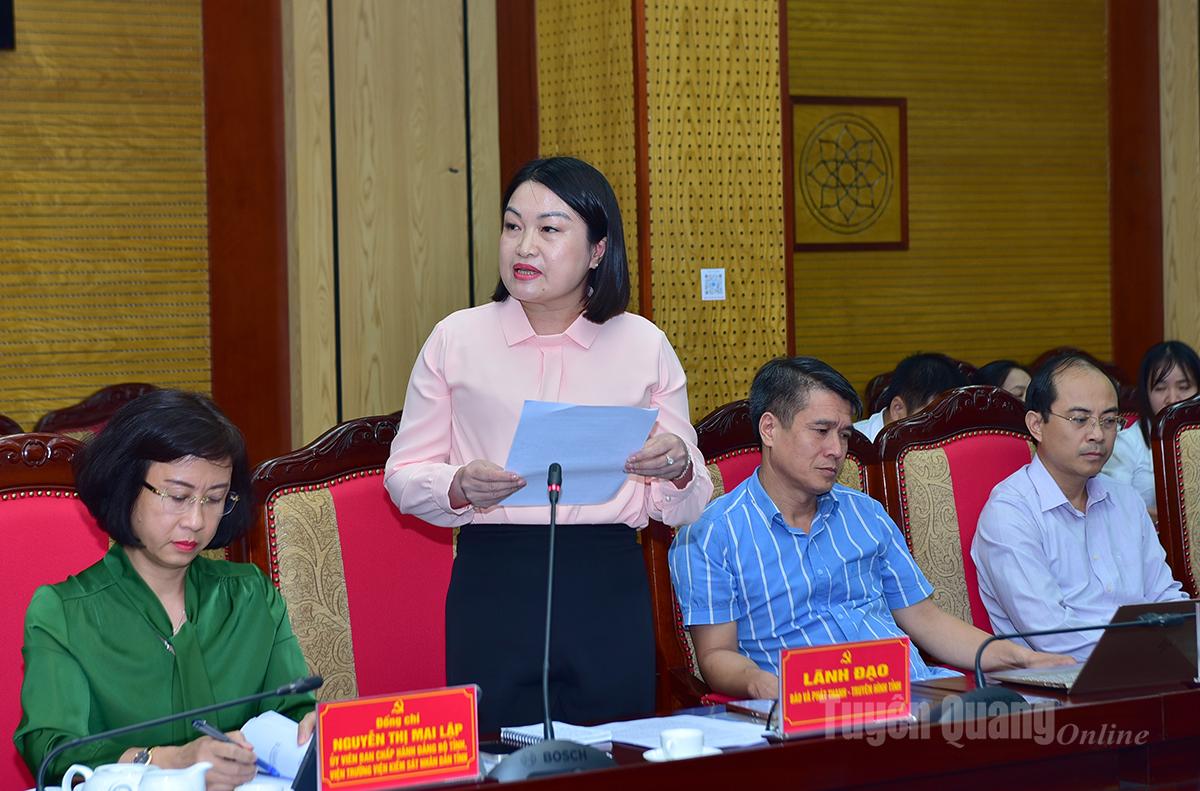 Đồng chí Phó Tổng Biên tập Báo và phát thanh, truyền hình tỉnh Nguyễn Thị Hoài Yên phát biểu thảo luận tại buổi làm việc.