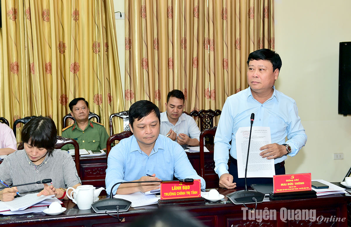 Đồng chí Tổng Biên tập Báo và Đài Phát thanh - Truyền hình tỉnh Mai Đức Thông phát biểu tại hội nghị.