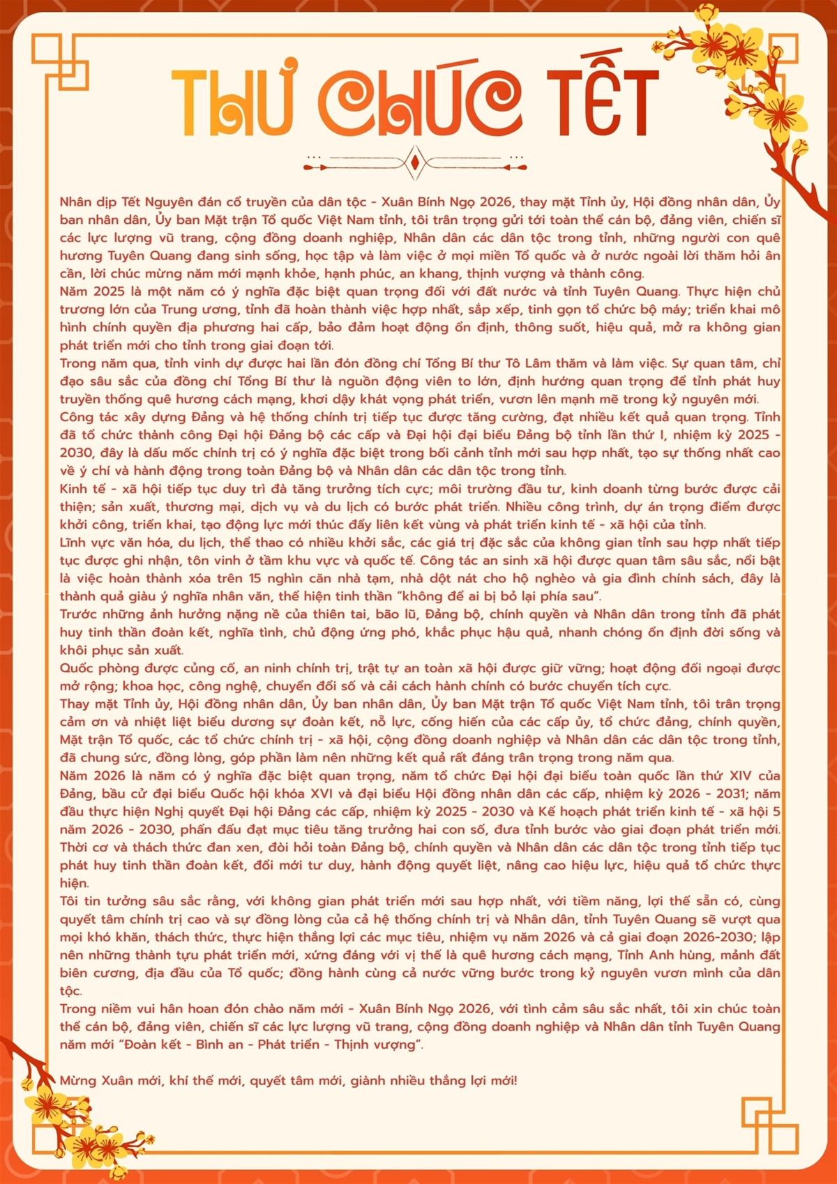Nhân dịp Tết Nguyên đán cổ truyền của dân tộc - Xuân Bính Ngọ 2026, thay mặt Tỉnh ủy, Hội đồng nhân dân, Ủy ban nhân dân, Ủy ban Mặt trận Tổ quốc Việt Nam tỉnh, tôi trân trọng gửi tới toàn thể cán bộ, đảng viên, chiến sĩ các lực lượng vũ trang, cộng đồng doanh nghiệp, Nhân dân các dân tộc trong tỉnh, những người con quê hương Tuyên Quang đang sinh sống, học tập và làm việc ở mọi miền Tổ quốc và ở nước ngoài lời thăm hỏi ân cần, lời chúc mừng năm mới mạnh khỏe, hạnh phúc, an khang, thịnh vượng và thành công.