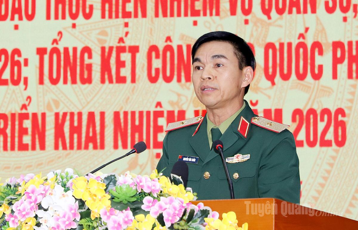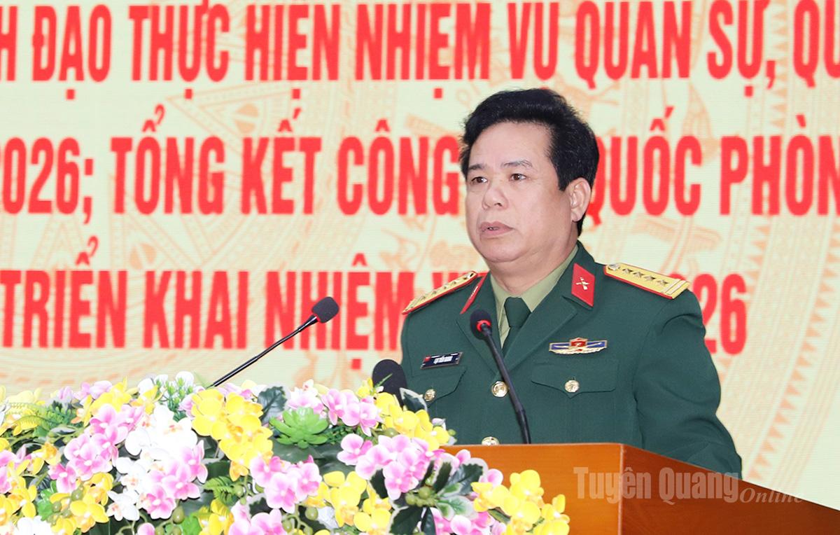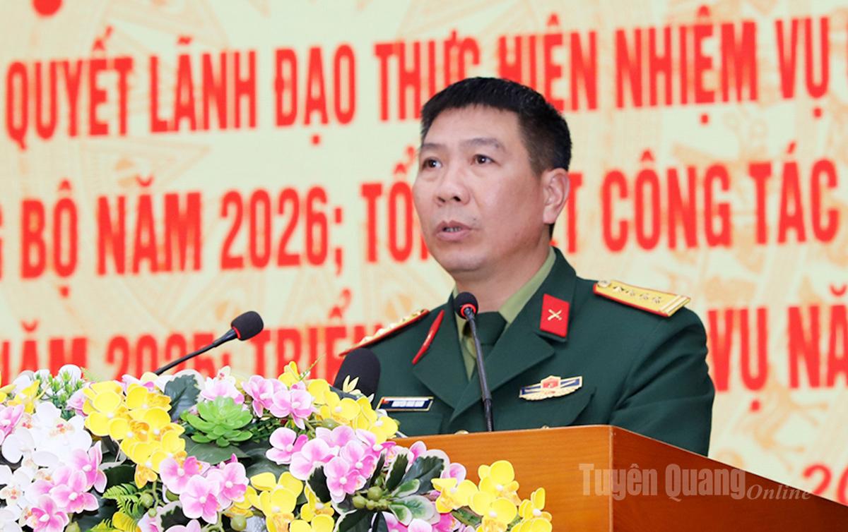 Phát biểu chỉ đạo tại hội nghị, Thiếu tướng Nguyễn Văn Xuân, Phó Tư lệnh Quân khu 2 ghi nhận và biểu dương những kết quả Đảng ủy Quân sự tỉnh Tuyên Quang đã đạt được trong năm vừa qua. Để thực hiện thắng lợi nhiệm vụ quân sự, quốc phòng năm 2026, đồng chí đề nghị Đảng ủy Quân sự tỉnh tiếp tục làm tốt công tác tham mưu cho Tỉnh ủy, UBND tỉnh lãnh đạo, chỉ đạo thực hiện tốt công tác quản lý về lĩnh vực Quốc phòng, tham mưu xử lý kịp thời, hiệu quả các tình huống về an ninh chính trị, trật tự an toàn xã hội, không để bị động, bất ngờ. Quán triệt, cụ thể hóa, triển khai thực hiện có hiệu quả các mục tiêu Nghị quyết Đại hội Đảng các cấp nhiệm kỳ 2025-2030. Đồng thời, lãnh đạo nâng cao chất lượng huấn luyện, khả năng sẵn sàng chiến đấu của lực lượng vũ trang tỉnh; tham mưu củng cố, kiện toàn, nâng cao chất lượng hoạt động của Ban Chỉ huy quân sự xã, phường; phát huy vai trò của Ban Chỉ huy phòng thủ khu vực, Ban Chỉ huy Bộ đội biên phòng trong công tác quân sự, quốc phòng, biên phòng trên địa bàn. Tập trung lãnh đạo xây dựng cơ quan, đơn vị vững mạnh toàn diện “Mẫu mực tiêu biểu”, giữ vững sự đoàn kết, thống nhất, xây dựng Đảng bộ quân sự tỉnh trong sạch, vững mạnh tiêu biểu.
