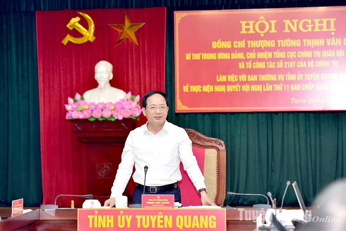 Phát biểu kết luận buổi làm việc, đồng chí Trịnh Văn Quyết, Bí thư Trung ương Đảng, Chủ nhiệm Tổng cục Chính trị QĐND Việt Nam ghi nhận những ý kiến đề xuất của hai tỉnh. Đánh giá cao việc 2 địa phương đã tổ chức thực hiện nghiêm túc các nhiệm vụ Nghị quyết Hội nghị lần thứ 11 Ban Chấp hành Trung ương Đảng, đồng chí nhấn mạnh, mục tiêu của tinh gọn bộ máy, sắp xếp đơn vị hành chính là để thúc đẩy tăng trưởng kinh tế xã hội, nâng cao đời sống của Nhân dân.