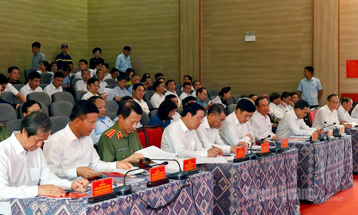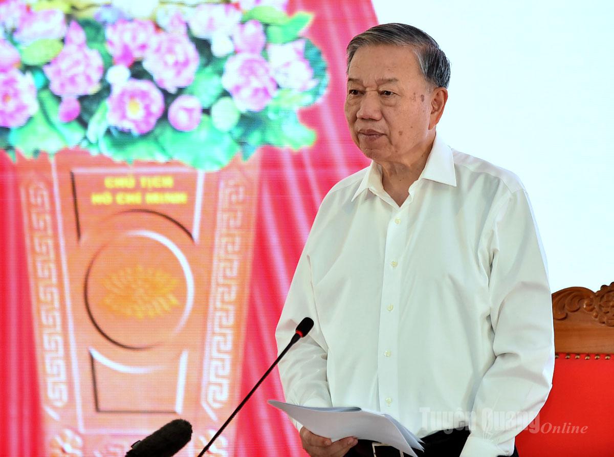 Mở đầu buổi làm việc, Tổng Bí thư Tô Lâm nhấn mạnh: Hai tỉnh Hà Giang và Tuyên Quang cũ sáp nhập thành tỉnh Tuyên Quang mới với nhiều dư địa phát triển mới. Nhiệm vụ đặt ra trước mắt rất nặng nề đòi hỏi cán bộ, đảng viên phải nêu cao tinh thần gương mẫu, trách nhiệm đi đầu trong các phong trào thực hiện nhiệm vụ chính trị, phát triển KTXH của địa phương. Trước mắt ưu tiên tập trung đẩy mạnh cải cách hành chính, nêu cao tinh thần phục vụ nhân dân; làm tốt công tác tuyên truyền, vận động nhân dân giải phóng mặt bằng, đẩy nhanh tiến độ thi công các công trình trọng điểm. Triển khai ngay 6 nhiệm vụ của Hội nghị lần thứ 12 Ban Chấp hành Trung ương Đảng khóa XIII và một số nhiệm vụ trọng tâm quan trọng khác.