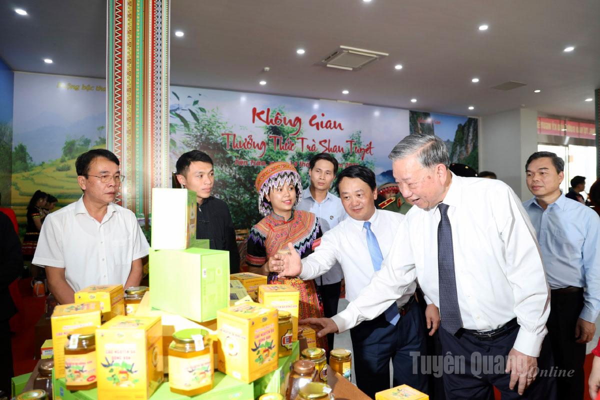 Tổng Bí thư Tô Lâm và các đại biểu tham quan gian trưng bày các sản phẩm OCOP tiêu biểu của tỉnh.