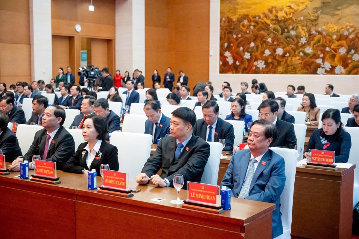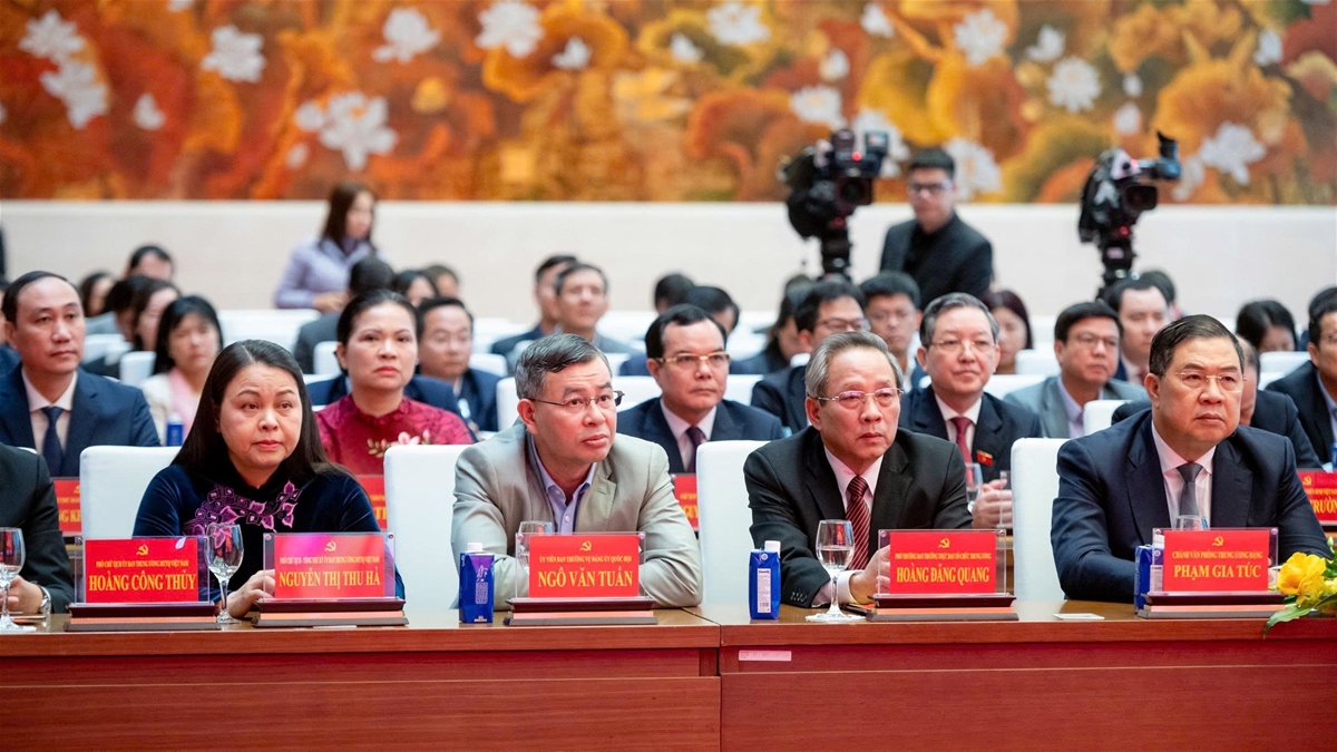 Tổng Bí thư Tô Lâm; Chủ tịch Quốc hội Trần Thanh Mẫn; Thường trực Ban Bí thư Trần Cẩm Tú; Trưởng Ban Tổ chức Trung ương Lê Minh Hưng; Chủ nhiệm Uỷ ban Kiểm tra Trung ương Nguyễn Duy Ngọc; các Phó Chủ tịch Quốc hội: Nguyễn Khắc Định, Nguyễn Đức Hải, Trần Quang Phương, Nguyễn Thị Thanh, Vũ Hồng Thanh, Lê Minh Hoan và các đại biểu dự buổi lễ. Ảnh: Phạm Thắng.