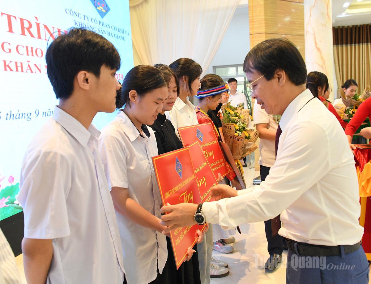 Chủ tịch UBND tỉnh Phan Huy Ngọc, lãnh đạo Sở Giáo dục và Đào tạo, Công ty cổ phần Cơ khí và Khoáng sản Hà Giang trao học bổng cho các tân sinh viên.