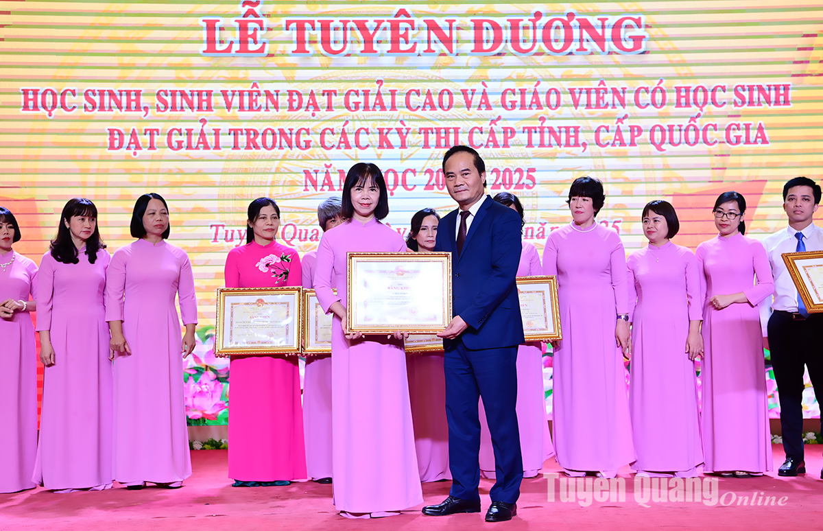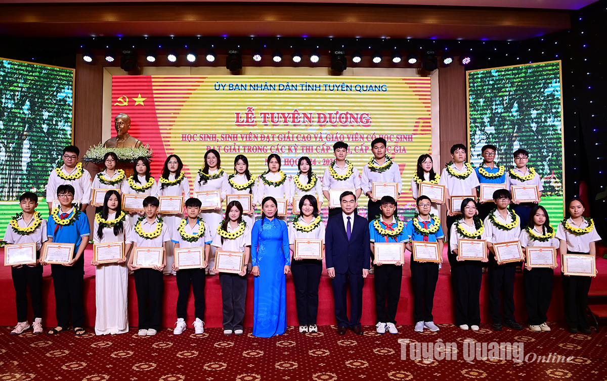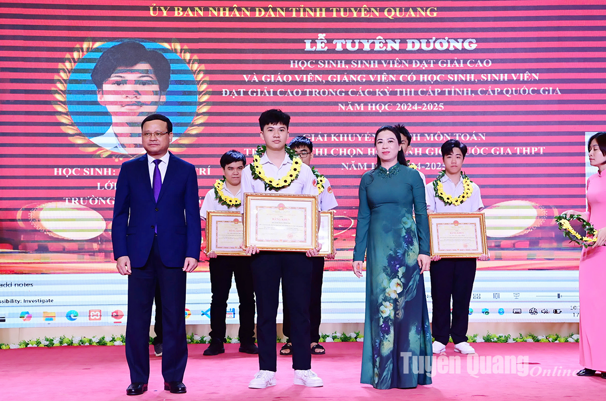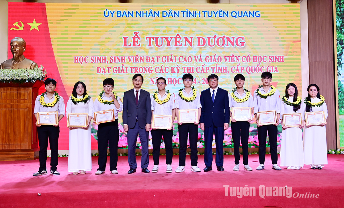 Ghi nhận những thành tích xuất sắc giáo viên, học sinh trong Kỳ thi chọn học sinh giỏi Quốc gia THPT năm học 2024- 2025 vừa qua, Bộ trưởng Bộ Giáo dục và Đào tạo tặng Bằng khen cho 6 học sinh đoạt giải Nhì và 22 học sinh đoạt giải Ba; Chủ tịch UBND tỉnh tặng Bằng khen cho tập thể Trường THPT Chuyên Tuyên Quang; 22 giáo viên có thành tích xuất sắc trong bồi dưỡng học sinh đoạt giải và 28 học sinh đoạt giải Khuyến khích.