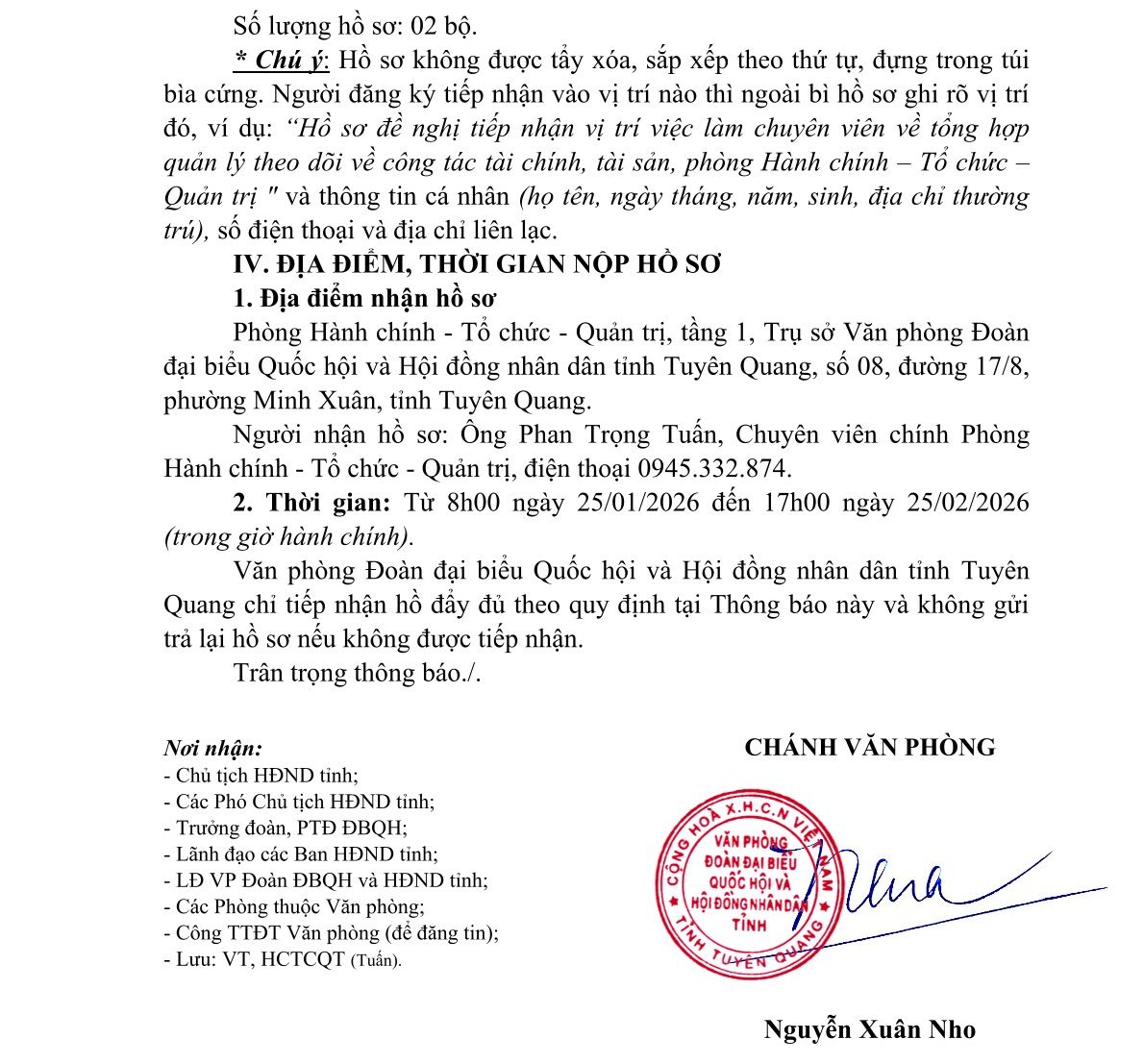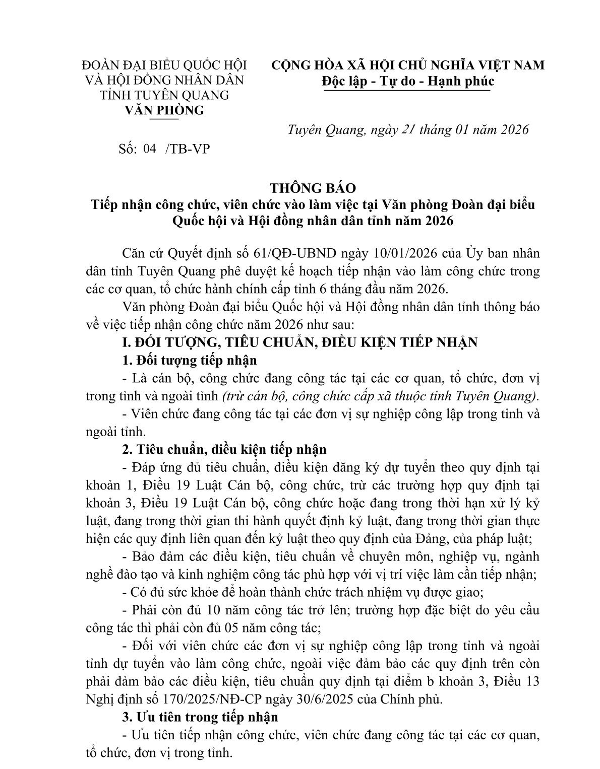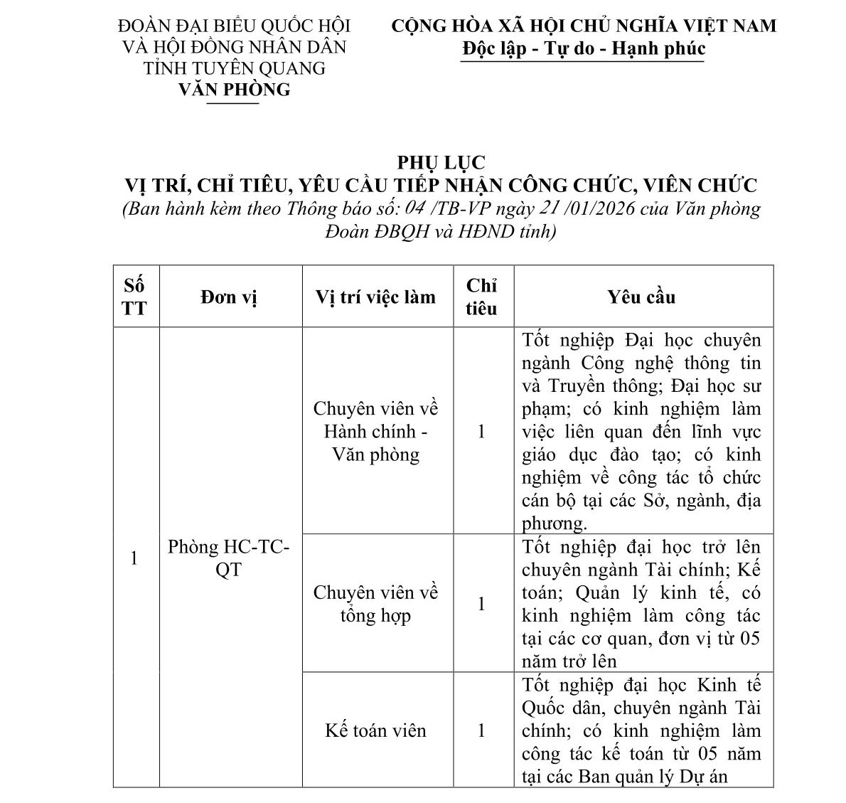 Thông báo tiếp nhận công chức, viên chức vào làm việc tại Văn phòng Đoàn đại biểu Quốc hội và Hội đồng nhân dân tỉnh năm 2026
